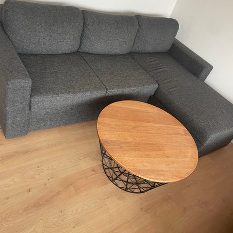 Hjørnesofa og komfortabel dobbeltseng ( udslået mål: 140 x 204 cm ) i en klar blå farve