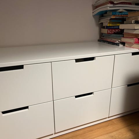 IKEA kommode med 3 skuffer i grønmalet overflade. Kommoden har et enkelt, glat design uden synlige greb og står på lave sokler. Egnet til opbevaring i soveværelse, entré eller stue, hvor der er behov for ekstra skuffeplads til tøj, tekstiler eller andre genstande.