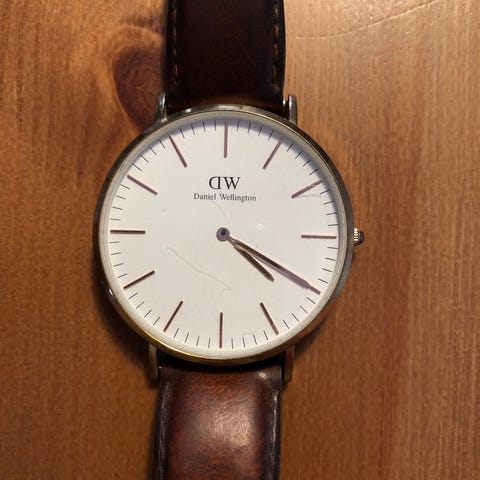 Daniel Wellington armbåndsur til kvinde med klassisk, rund hvid urskive og sort læderrem. Uret har minimalistisk design med tynde time- og minutmarkeringer samt to visere. Sølvfarvet urkasse og enkel, ren urskive uden datovisning. Velegnet som hverdagsur eller til mere formelt brug.
