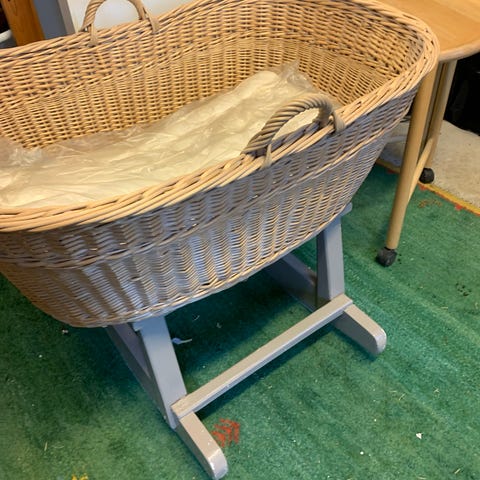 vugge i flet med træstel på hjul. Vuggen har en aftagelig, polstret stofkant og madras. Madrassen er forsynet med Cocoon økologisk bomuldsbetræk, som kan tages af og vaskes. Vuggen er egnet til spædbørn i den første periode og kan nemt flyttes rundt i rummet ved hjælp af hjulene. Neutral, lys farve der passer ind i de fleste hjem.