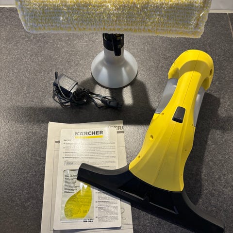 Kärcher vinduesvasker med 2 stk. rengøringsmundstykker, sprayflaske, 2 stk. mikrofiberpad og væske. Oplader medfølger. Prisen er fast