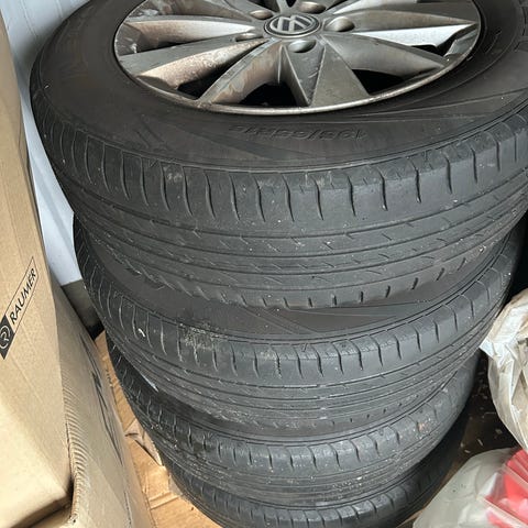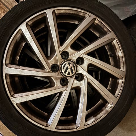 Alufælge fra MEGA WHEELS monteret med sommerdæk. Der er ikke meget mønster tilbage.