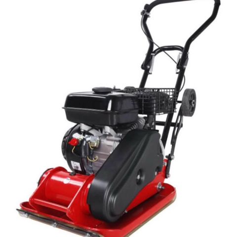 Benzindrevet komprimeringsmaskine egnet til komprimering af jord, grus og belægningssten ved anlægs- og havearbejde. Maskinen har håndtag og transporthjul for lettere håndtering.