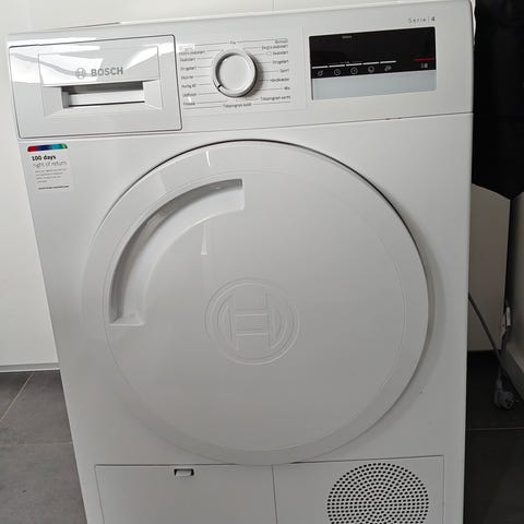 Bosch aftrækstørretumbler. Traditionel tørretumbler med aftræk, der leder fugtig luft ud gennem aftræksslange. Egnet til installation i rum med mulighed for aftræk til det fri. Tørretumbleren har frontbetjening med programvælger og knapper på frontpanelet. Velegnet til almindelig tøjtørring i husstande, hvor der ønskes en simpel og funktionel aftrækstumbler.