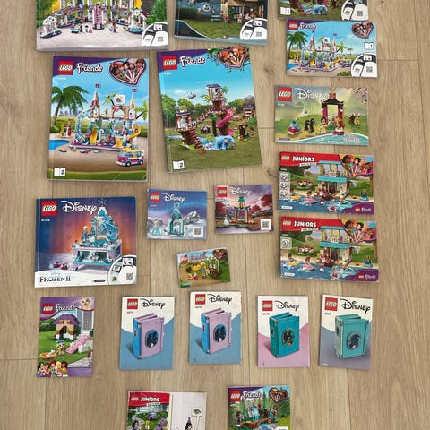 13 Lego friends sæt med manualer. Kun de 4 er delvis samlet. Resten af sættene plus det ekstra ligger i de røde Lego bokse som også medfølger.