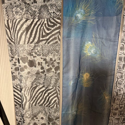 3 tørklæder i 3 størrelser (1 gråt i str. 0,35 x 1,68, 1 flerfarvet str. 0,88 x 0,92, 1 flerfarvet 1,04 x 1,90) sælges samlet for 75 kr.