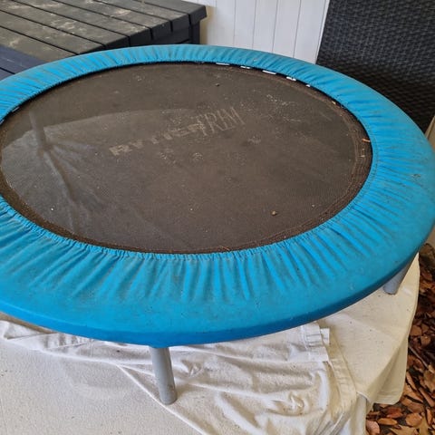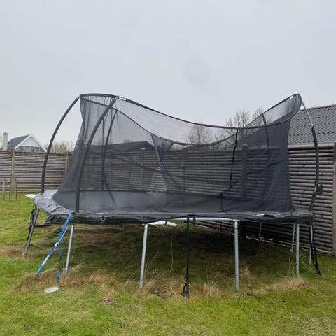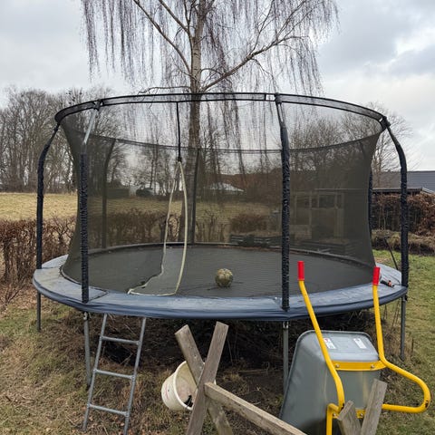 God velfungerende stor trampolin. En af de tynde stænger er faldet af, muligvis knækket. Vores børn gider dog ikke trampolin mere, så den skal væk.