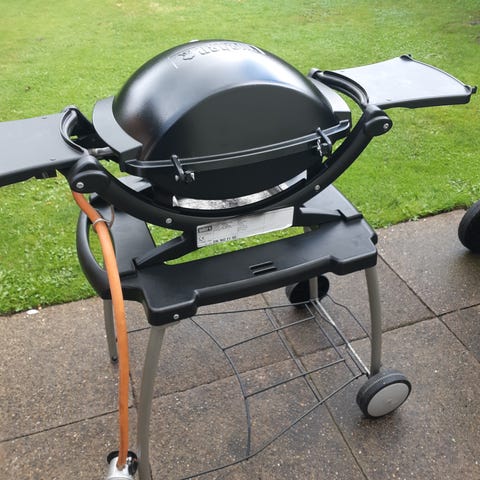 Weber Q 1200gasgrill med låg og grillrist i støbejern. Grillen har integrerede sideborde og brænder i bunden. Der medfølger gasslange og regulator, til 11 Kg samt lille gasflaske samt en gasflaske som vist på billederne. Velegnet som kompakt gasgrill til terrasse, altan eller campingbrug.