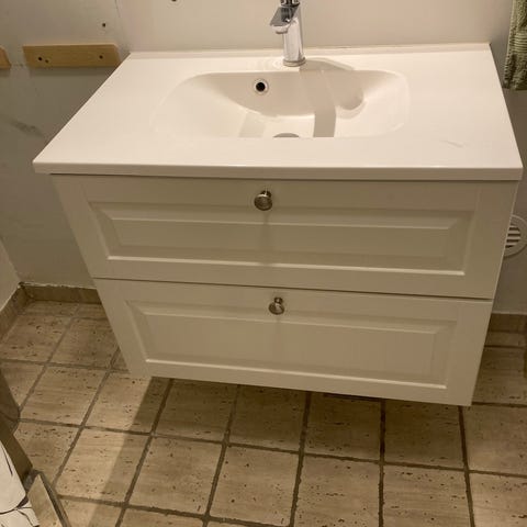Armatur, bordplade med vask og ophæng til skabet medfølger.
