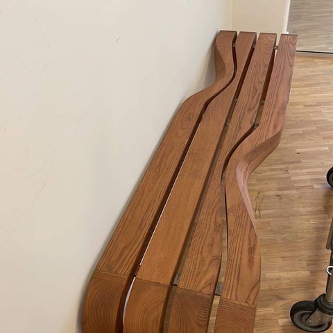 Dialog bænk, varmebehandlet ask, rustfrie ben. Vægt 35 kg. 184x40x45