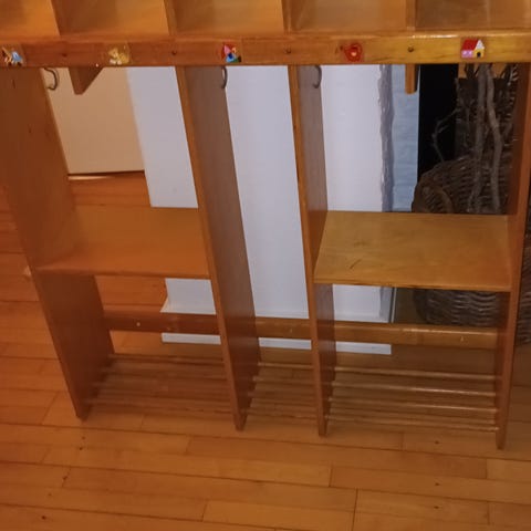 Børnegarderobe entrémøbel med flere opdelte rum til overtøj og sko. Møblet har integreret bænk i bunden, hylder og stænger til ophæng samt kroge til jakker. Den åbne konstruktion gør det let for børn at nå både siddeplads og opbevaringsplads. Velegnet til entré, gang eller institution, hvor der er behov for organiseret opbevaring af børns tøj og fodtøj.