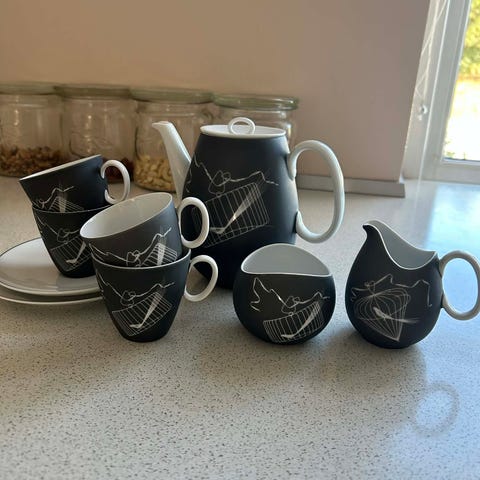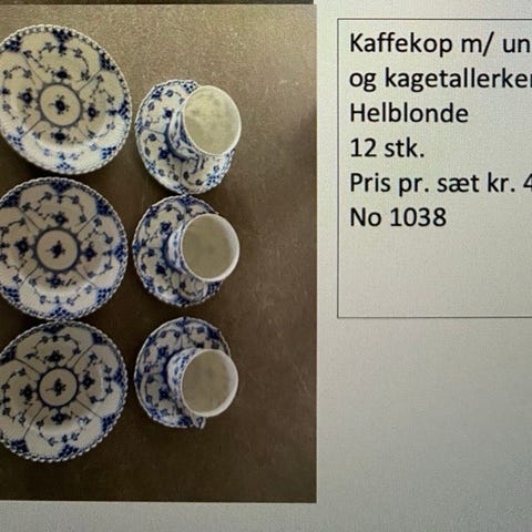 10 kaffekopper, 10 underkopper og 10 desserttallerkener. 1. Sortering, se foto. Næsten aldrig brugt