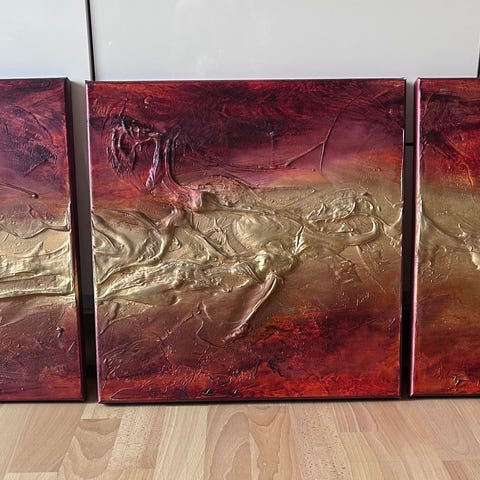 Abstrakt maleri bestående af tre sammenhængende lærreder i et triptykon. Motivet er udført i struktureret, reliefagtig teknik med kraftige penselstrøg og modelleret overflade. Farverne er primært dybe orange og brune nuancer kombineret med guld, som skaber en varm og kontrastfuld virkning. Hvert lærred er kvadratisk og kan hænges samlet som ét motiv eller fordelt på væggen efter ønske. Velegnet som vægdekoration i stue, kontor eller andre opholdsrum.
