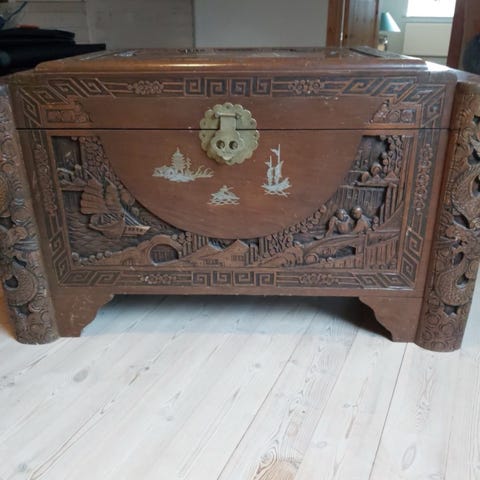 Kinesisk kamferkiste med utrolig flotte udskæringer og glas på låget.