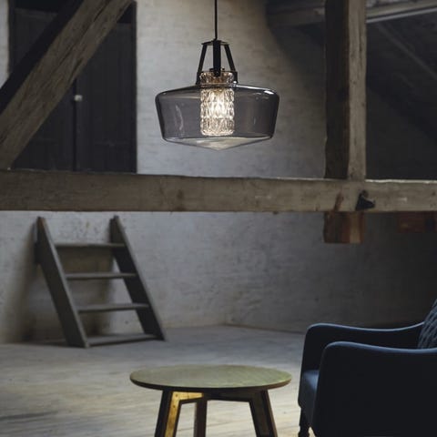 Lampen er i mundblæst glæs, læder og pulverlakeret stål.