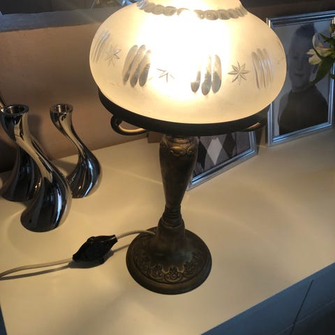 Messing Pigeonlampe fra 1885. Det hvælvede frostede glas er uoriginalt, men håndblæst til at passe, og identisk med det originale. Den er gammel og patineret med et messingbånd der har løsnet sig. Den var funktionel for ca 30 år siden, da jeg var barn, men vægen skal nok skiftes hvis den skal i brug igen.