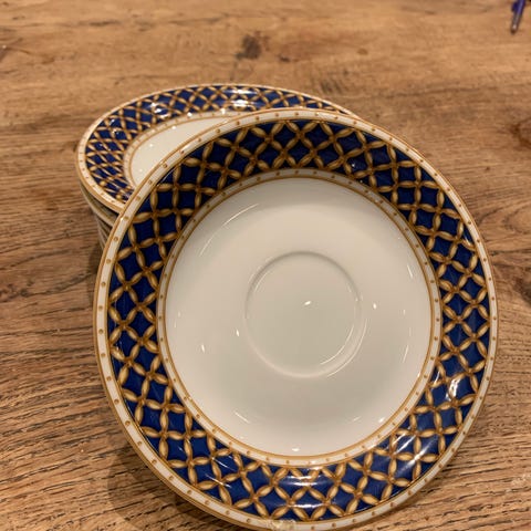 Royal Copenhagen Liselund, kopper (072), underkopper og kagetallerkener, fremstillet i porcelæn. Stellet er designet af Diana Holstein. Mørkeblå bundfarve. 8 sæt i alt. Meget fin stand med meget små brugsspor. Sælges samlet.