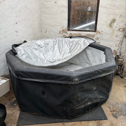 4 personers jacuzzi 200cmx180cm. Den er ca 4-5 år gammel ogvelholdt. Den er tømt og frakobel el. Den sidder i træterrassen og bæreremme sidder under den.