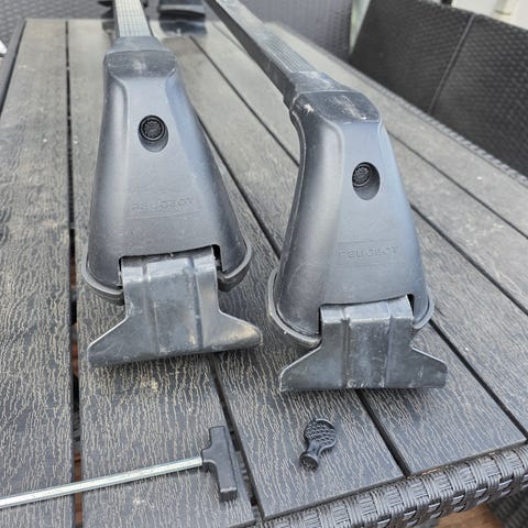 Tagbøjlerne består af to aluminiumsprofiler med sorte plastfødder. De er beregnet til montering på tagfæsterne på Peugeot 508 SW, som vist i den medfølgende monteringsvejledning.