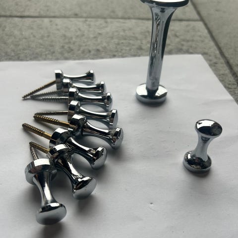 Grest Markant håndklædekrog i krom. Vægmonteret model med to kroge, leveres i original æske. Fremstillet til ophæng af håndklæder eller lignende i badeværelse eller køkken. Ifølge emballagen leveres den komplet med murpløkker og skruer.