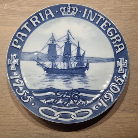 Bagsiden af pladen er forsynet med ophæng, så den let kan monteres på væggen som et dekorativt og historisk stykke porcelæn. Der ses mindre afslag på både kant og fodring, hvilket fremgår af billederne, men helhedsindtrykket er fortsat harmonisk og samlervenligt. Diameteren er 19,5 cm.