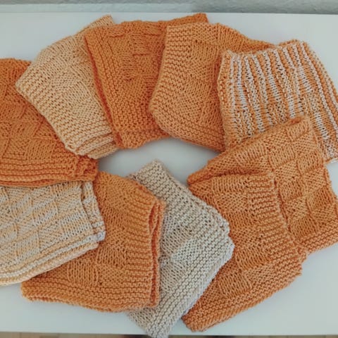 8 STK. KARKLUDE/VASKEKLUDE M.M. STRIKKET I 100% BOMULDSGARN MED FORSKELLIGE FARVER. - MÅL: CA. 24 X 25 CM. - VED FORSENDELSE MED DAO FIKS OG FÆRDIG ELLER PÅ DEN GAMLE MÅDE.
