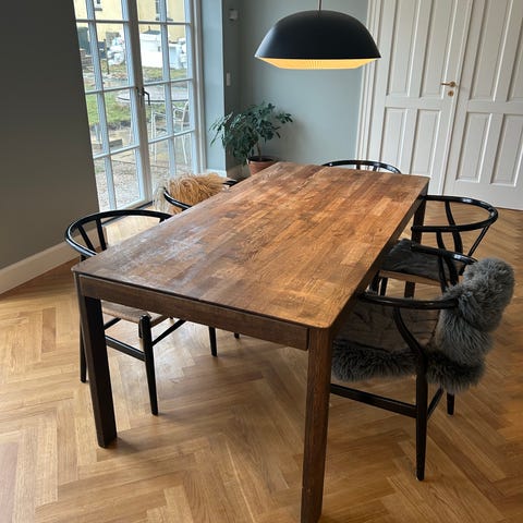 Bordet er i finer af valnøddetræ og fremstår meget flot. Det er 230cm langt med den medfølgende midterplade isat, og 180cm langt uden midterplade. Bordet er fra Bolia (model: Wake).