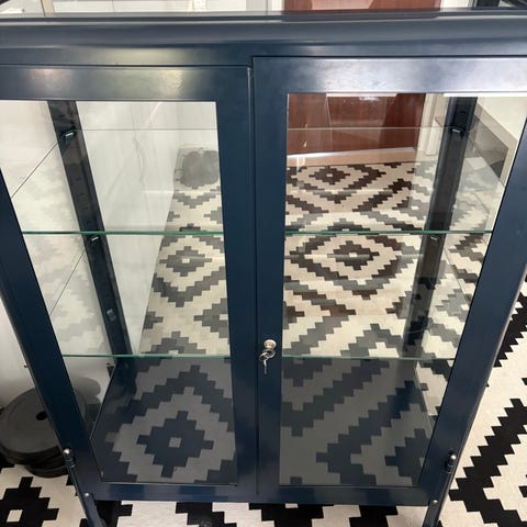 Flot glasvitrineskab med lås. Den hedder Milsbo fra Ikea, normalpris 2000 kr.