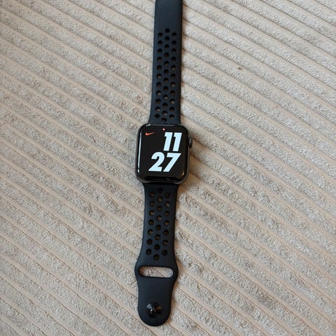 Apple Watch smartwatch med gråt sportsrem. Uret har rektangulær touchskærm og bagside med sensorer til måling af aktivitet og pulsrelaterede data. Remmen er i stoflignende materiale med justerbar lukning, egnet til daglig brug. Uret er designet til brug sammen med iPhone og kan vise beskeder, notifikationer og andre funktioner direkte på håndleddet.holder til en helt dag, er afinstalleret, derfor kendes batteri tilstand desværre ikke, fejler intet
