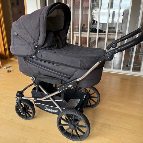 Emmaljunga barnevogn med tilhørende lift og klapvognsdel i grå tekstil. Vognen har stor liggedel med madras og polstret inderfor, egnet til spædbarn. Klapvognsdelen har justerbar sele og polstret sæde for større barn. Der medfølger matchende kørepose/fodpose til klapvognsdel. Stellet har fire hjul og justerbart håndtag. Velegnet til daglig transport af barn fra spæd til klapvognsalder.