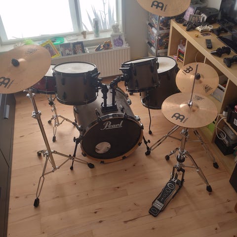 Mapex trommesæt i grå finish. Sættet består af stortromme, lilletromme, flere tammer samt hi-hat og crash/ride-bækkener fra Meinl HCS-serien. Med tilhørende stativer og trommestol som vist på billederne. Velegnet til øvelokale eller hjemmebrug for trommeslagere på forskellige niveauer.