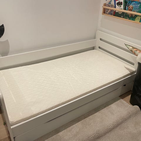 IKEA enkeltseng med opbevaringsskuffer i hvid. Sengen har lamelbund og to store skuffer under liggefladen, som kan bruges til opbevaring af sengetøj, legetøj eller tøj. Egnet som juniorseng eller enkeltseng til børneværelse.