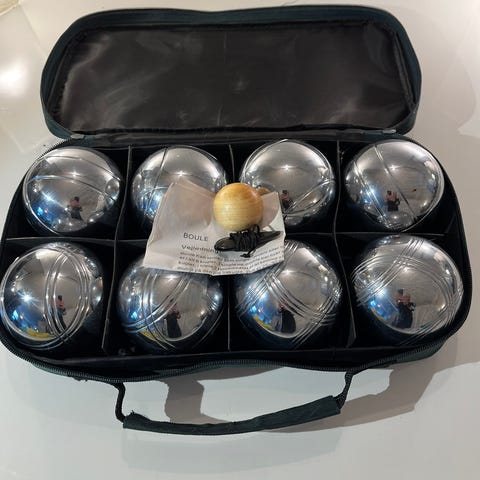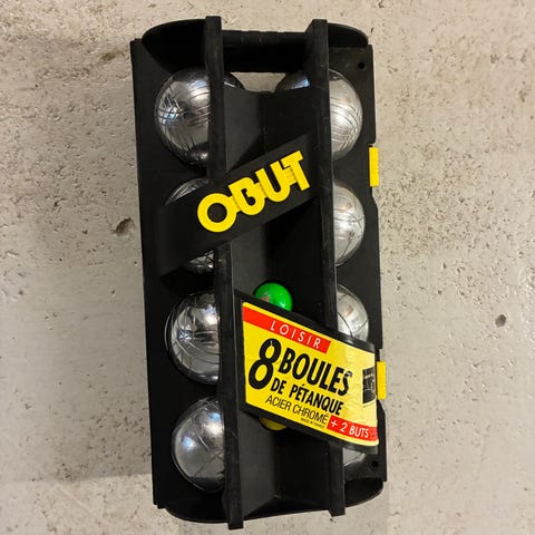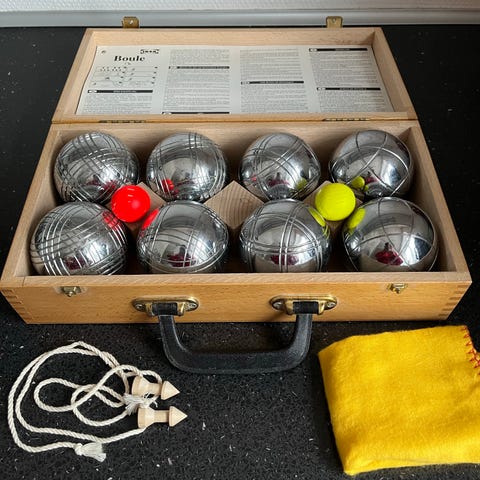 IKEA Boules petanquesæt i trækasse. Sættet indeholder 8 metalboules samt to små målkugler i plast. Kuglerne ligger i en indvendig inddeling i kassen, som har bærehåndtag og metalbeslag. Der medfølger trykte spil- og brugsanvisninger på indersiden af låget.