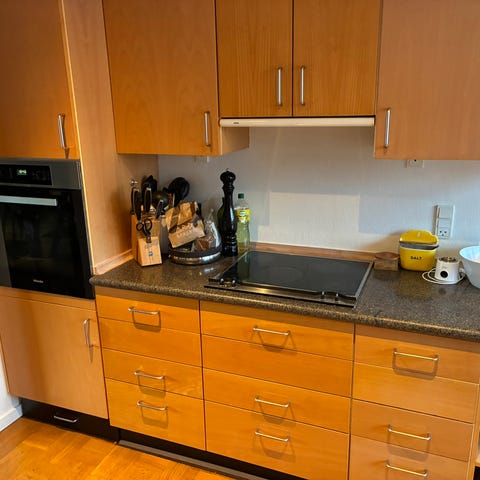 1 x højskab til køleskab m/ 1 x overskab B: 60 cm, H: 50 cm, D indv.: 52,5 cm samt 1 x skuffe under køleskab B: 60 cm, H: 22 cm, D indv.: 52,5 cm.