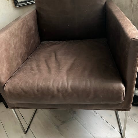 Sort læder / egetræ lænestol købt hos Buehøjgård møbler i Smørum.