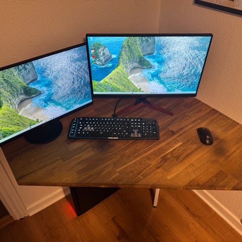 Helt sæt med computer,bord,tastatur,skærm,mus og headset
