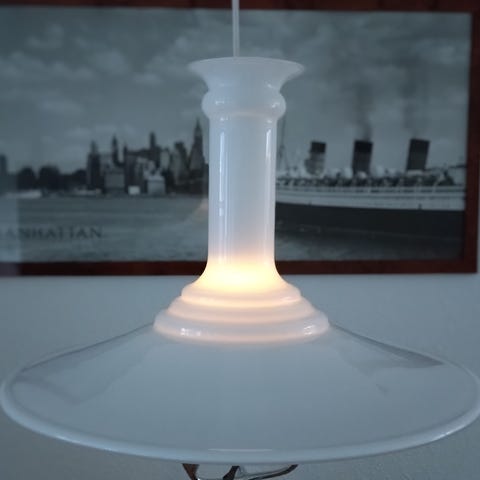 Elegant og tidstypisk Holmegaard Etude pendel designet af Michael Bang og formgivet i 1978. Lampen er udført i mundblæst hvidt opalglas, der spreder et blødt og behageligt lys.