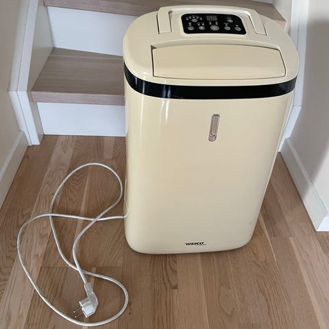 Waco 10 affugter i hvid. Enheden tilsluttes 230-240V ~ 50Hz og har en effekt på 200W. Bagpå sidder typeskilt med modelbetegnelse og tekniske data. Egnet til affugtning af indendørs rum, f.eks. bolig, kælder eller bryggers, hvor der er behov for at reducere luftfugtigheden.