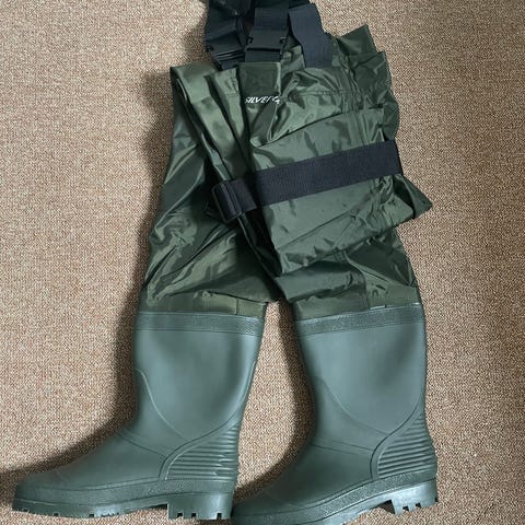 Ocean waders gummistøvler i blå farve, størrelse 28. Høje vaders med integrerede gummistøvler og kraftig, mønstret sål i kontrastfarve. Udstyret med justerbare seler og spænder for fastgørelse over skuldrene.