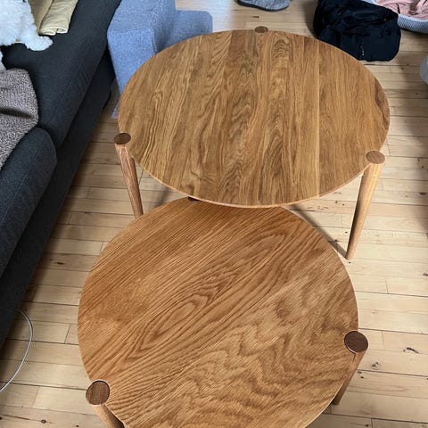 To sofaer, et sofabord og et hjørnebord med kork overflade, stel i egetræ