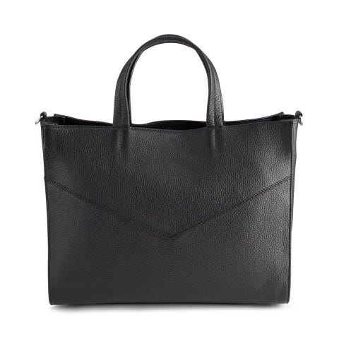 Arbejdstaske fra Markberg. Aldrig brugt. Okselæder. Den måler 40 cm i bredden. 32 cm i højde og bunden måler 12 cm i dybden.