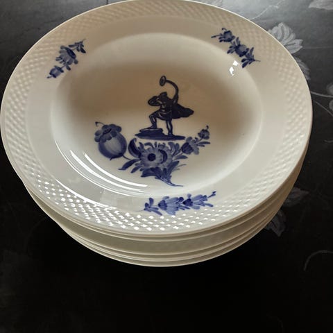 Royal Copenhagen dybe tallerkener i hvid porcelæn med blå dekoration. Tallerkenerne har klassisk rund form med bred kant og blomster- og bladmotiv i blå nuancer. Velegnet til servering af fx suppe, pasta eller gryderetter. Bundstempel fra Royal Copenhagen på undersiden angiver producent og serieoplysninger. Skriv for mere info:) kan hentes i københavn tør ikke sende så det på eget ansvar