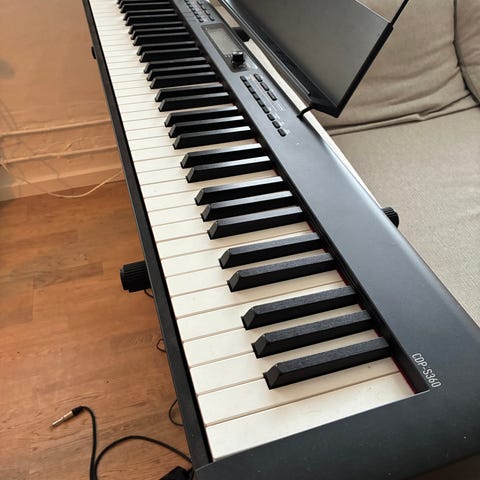 Kawai digitalpiano i sort kabinet. Instrumentet har fuldt klaviatur med vægtede tangenter, indbyggede højttalere og kontrolpanel med display og flere funktionsknapper til lyde og indstillinger. Egnet til både øvning derhjemme og brug i undervisningssammenhæng.