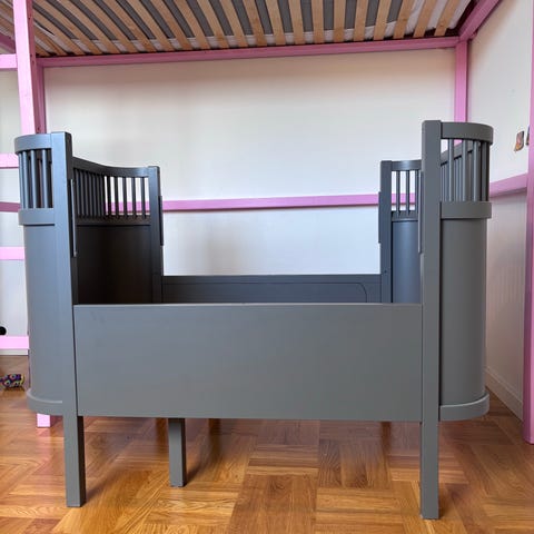 Derefter kan sengen ombygges til en lille seng med eller uden rygstykke, og senere hen kan siderne på den lille seng forlænges, så den får en længde på 166 cm.