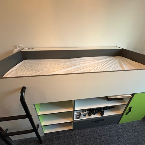 Halvhøj seng med to meget rummelige skuffer på hjul og 5 rum til opbevaring af spil, legetøj eller bøger :)