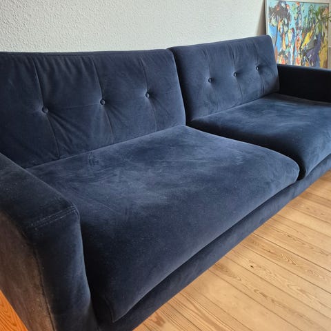 Pæn, enkel sofa med puf i fløjl fra Møbelkompagniet. God at sidde i og perfekt til en god film.