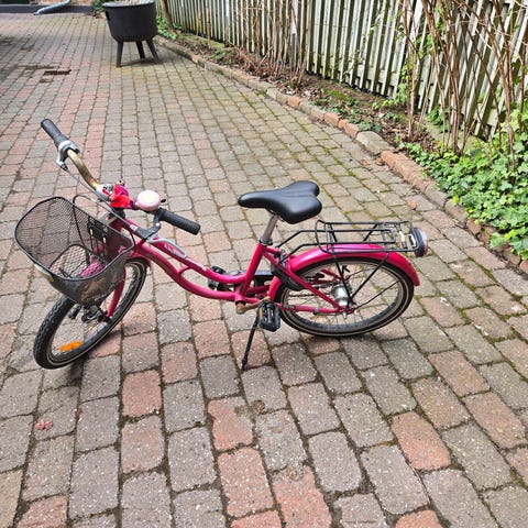 Børnecykel med 20" hjul i turkis farve. Cyklen har lav indstigning, bagagebærer, kædeskærm og støtteben. Der er monteret fletkurv på styret samt reflekser på hjul og bagpå. Sadel og håndtag er i brun farve. Velegnet som hverdagscykel til barn i skole- eller fritidsbrug. Passe til 6-8 år.