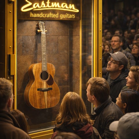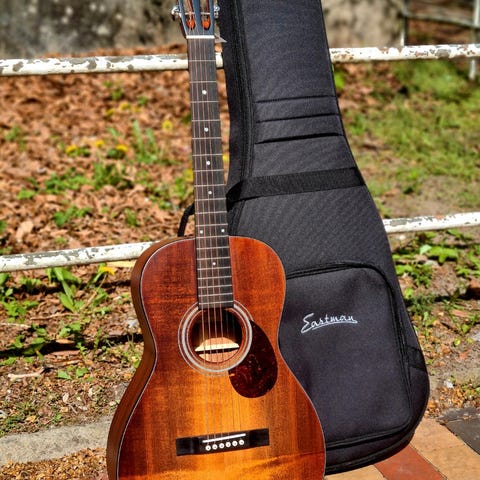 Helt ny Eastman akustisk guitar . Forside i lys naturfinish og mørk bagside og sider. Gribebræt med indlagte markeringer og hoved med gyldne stemmeskruer.