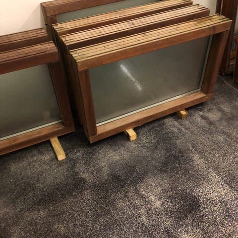 12 mahogni termo vinduer (2 lags), 1 stk. med frosted glas, 89×123×12, tophængt. 1500,-/stk.