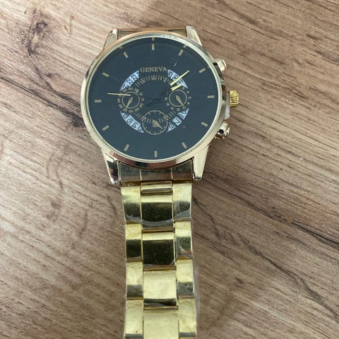 Guess herreur til mænd med blå urskive og guldfarvet metal lænke. Uret har rund urskive med tydelige timemarkeringer og roterende bezel. Designet er markant med flere funktionsvisere på skiven og kraftig lænke med foldelås. Velegnet som hverdagsur eller til mere formelle anledninger.pris 250 kr